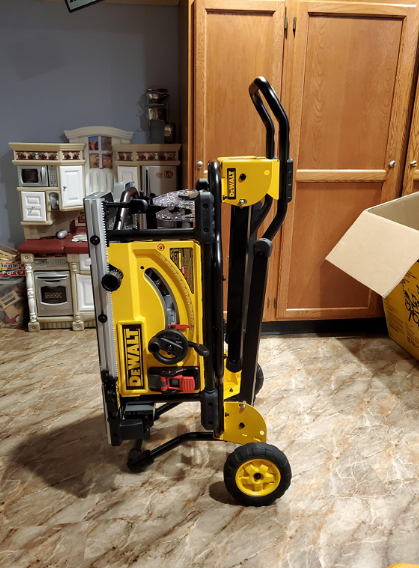 Features a 15.0A high torque motor with the power to cut pressure treated lumber and hardwoods. Rack & Pinion Telescoping Fence System Make fence adjustments fast, smooth and accurate. Rolling stand designed for easy set up and breakdown with excellent stability. Other Specs: Max rip to left of blade – 22inch | Max rip to right of blade – 32-1/2inch | Max width of Dado – 13/16inch | Arbor size – 5/8inch | Amps – 15 | Depth of cut at 45inch – 2-1/4inch | Depth of cut at 90° – 3-1/8inch | No Load Speed: 4800 RPM. Your purchase includes one Dewalt table saw, 10inch 24-tooth carbide blade, rolling stand, push stick, miter gauge, rip fence, 2x blade wrenches, blade guard assembly manual.